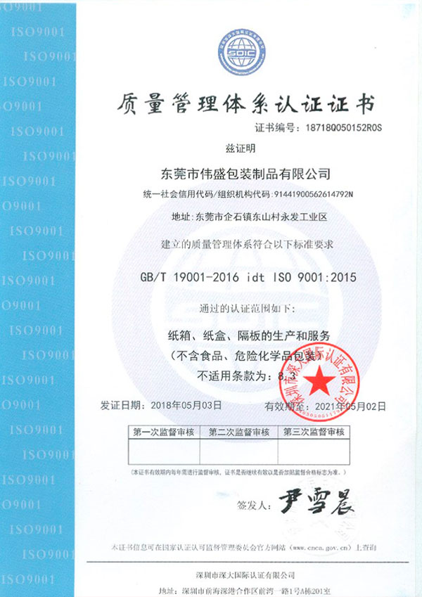 東莞市偉盛包裝制品有限公司成立于2010年,已通過ISO9001質量體系和ISO14001環境體系認證,公司占地面積5000平方米,十幾年的發展,公司一直致力于紙箱、紙盒、啤盒、彩盒、飛機盒等紙制品,廣泛應用于電子,家私、工藝品、燈飾、五金、塑膠等產品的包裝上,歡迎新老客戶致電垂詢。
